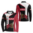 - Design: Bold red color with unique sleeve accents and subtle Red Bull graphics.